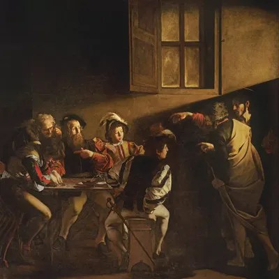 Michelangelo merisi da caravaggio, calling of st. The subject traditionally was represented either indoors or out;. Sometimes saint matthew is shown inside a building, with christ outside (following the biblical text) summoning him through a window.